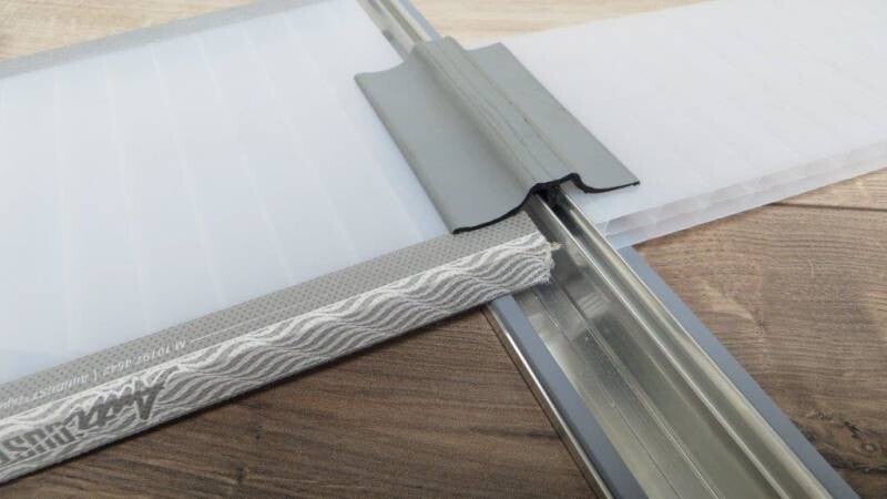 Afdekrubber grijs voor polycarbonaat platen.Leverbaar stuk van 6 meter, standaard kleur is grijs en wit
